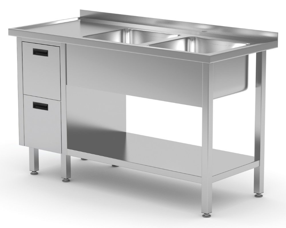 Stół ze stali nierdzewnej z dwoma zlewami, półką i szafką z dwiema szufladami - komory po prawej stronie o wymiarach 1800x700x(h)850 mm
