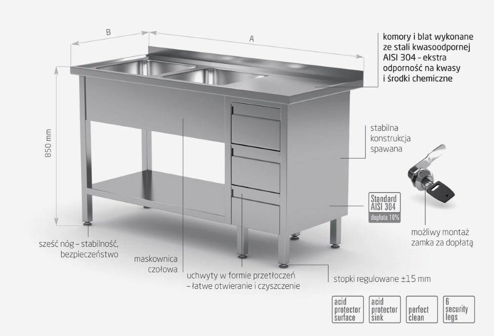 - zlewy i blat wykonane ze stali nierdzewnej tzw. kwasówki AISI 304 o wysokiej odporności na kwasy i środki chemiczne,