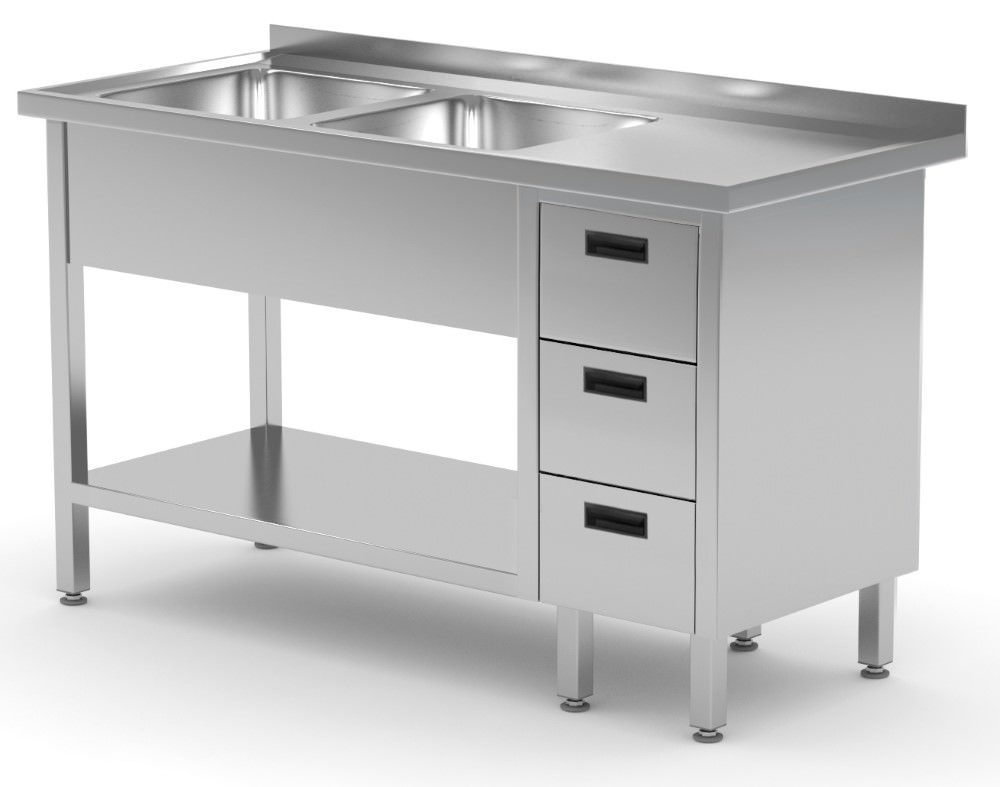 Stół z dwoma zlewami, półką i szafką z trzema szufladami - komory po lewej stronie | 1600x600 mm