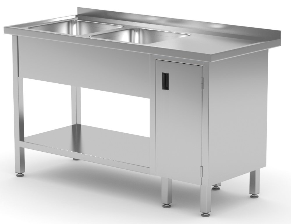 Stół ze stali nierdzewnej z dwoma zlewami, półką i szafką z drzwiami na zawiasach - komory po lewej stronie o wymiarach 1600x700x(h)850 mm