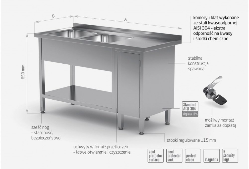 - zlewy i blat wykonane ze stali nierdzewnej tzw. kwasówki AISI 304 o wysokiej odporności na kwasy i środki chemiczne,