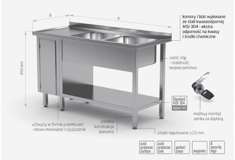 - zlewy i blat wykonane ze stali nierdzewnej tzw. kwasówki AISI 304 o wysokiej odporności na kwasy i środki chemiczne,