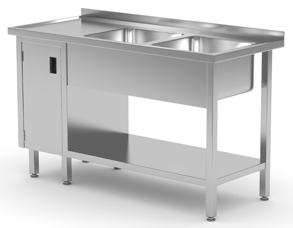 Stół ze stali nierdzewnej z dwoma zlewami, półką i szafką z drzwiami na zawiasach - komory po prawej stronie o wymiarach 1700x700x(h)850 mm