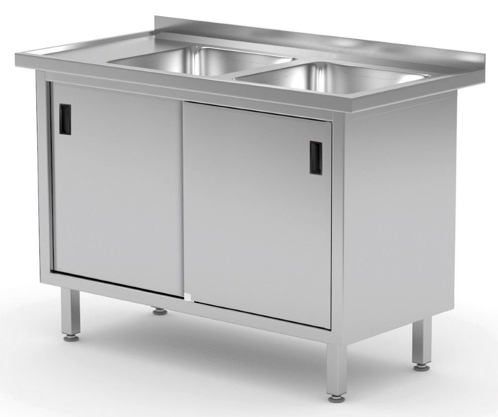 Stół ze stali nierdzewnej z dwoma zlewami, szafka z drzwiami suwanymi - komory po prawej stronie o wymiarach 1200x700x(h)850 mm