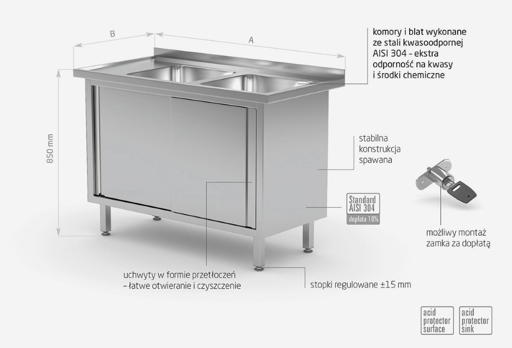 - zlewy i blat wykonane ze stali nierdzewnej tzw. kwasówki AISI 304 o wysokiej odporności na kwasy i środki chemiczne,