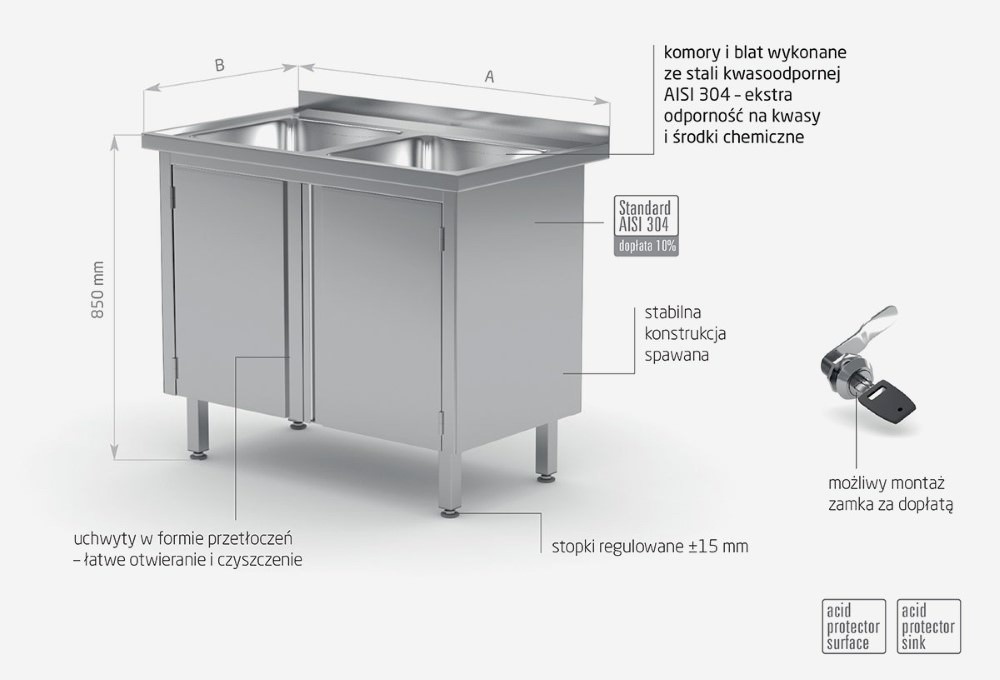 - zlewy i blat wykonane ze stali nierdzewnej tzw. kwasówki AISI 304 o wysokiej odporności na kwasy i środki chemiczne,