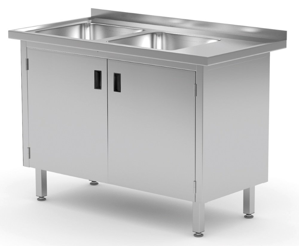 Stół ze stali nierdzewnej z dwoma zlewami, szafka z drzwiami na zawiasach - komory po lewej stronie o wymiarach 1400x700x(h)850 mm