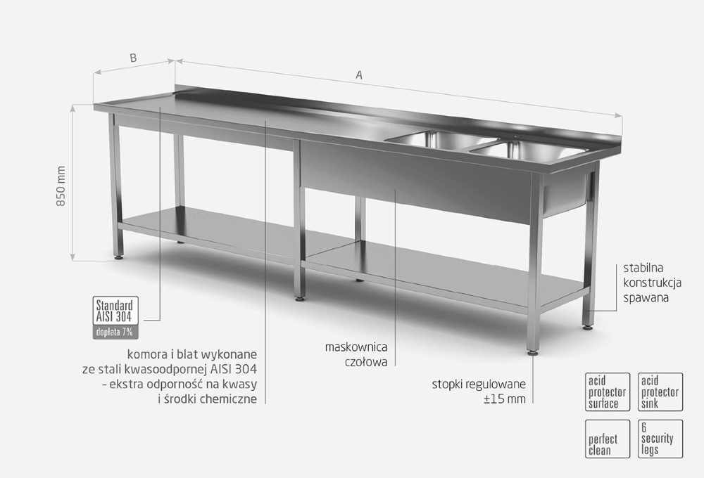 - zlewy i blat wykonane ze stali nierdzewnej tzw. kwasówki AISI 304 o wysokiej odporności na kwasy i środki chemiczne,