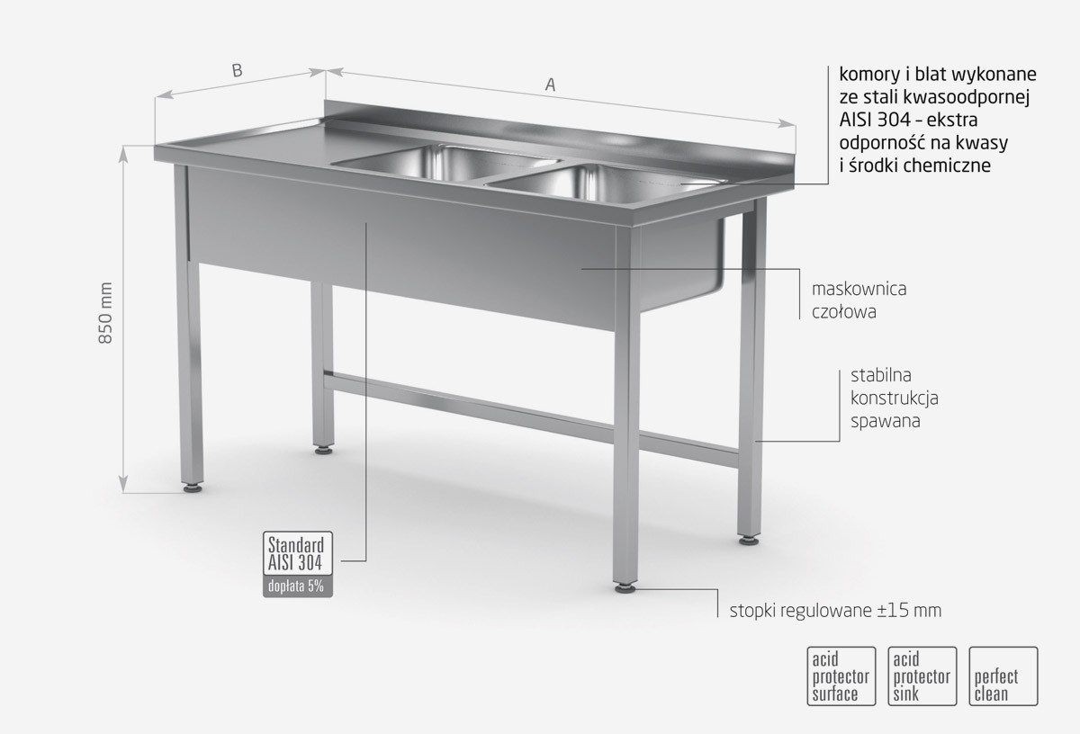 - zlewy i blat wykonane ze stali nierdzewnej tzw. kwasówki AISI 304 o wysokiej odporności na kwasy i środki chemiczne,