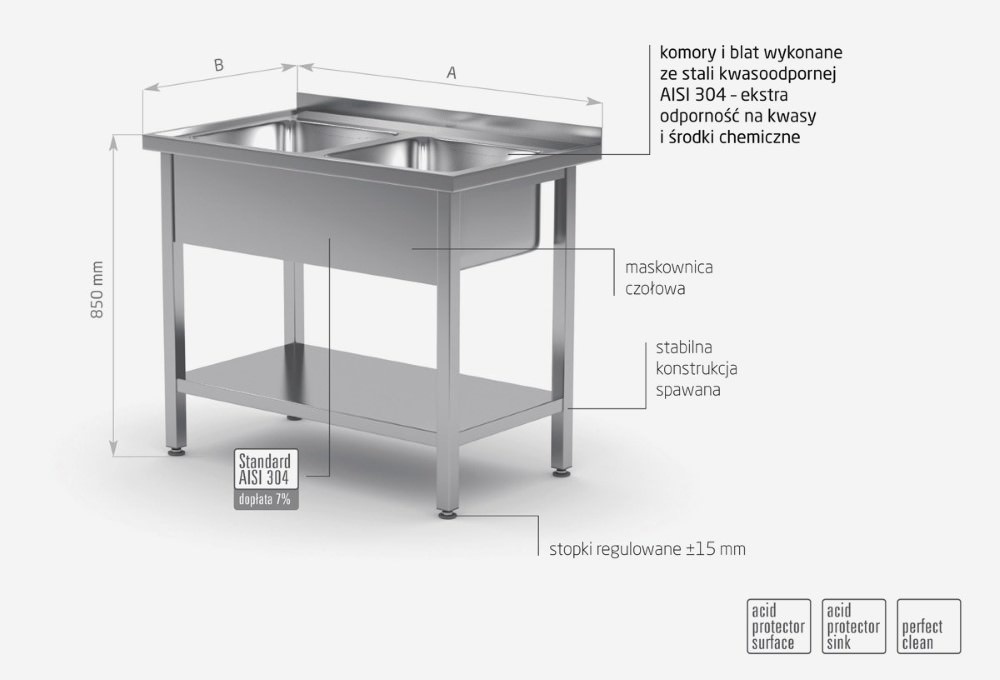 - zlewy i blat wykonane ze stali nierdzewnej tzw. kwasówki AISI 304 o wysokiej odporności na kwasy i środki chemiczne,
