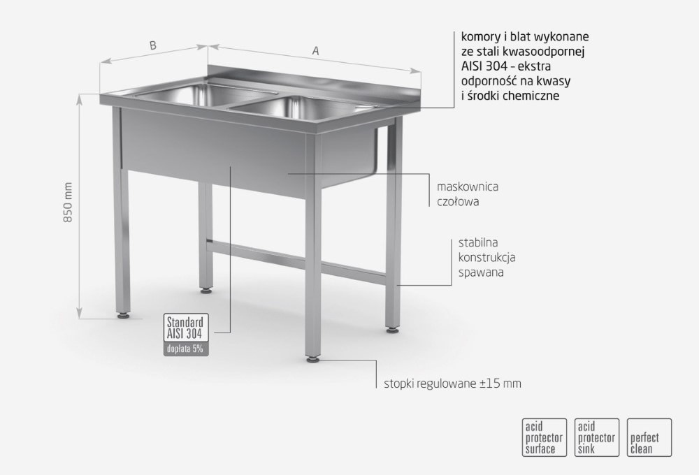 - zlewy i blat wykonane ze stali nierdzewnej tzw. kwasówki AISI 304 o wysokiej odporności na kwasy i środki chemiczne,