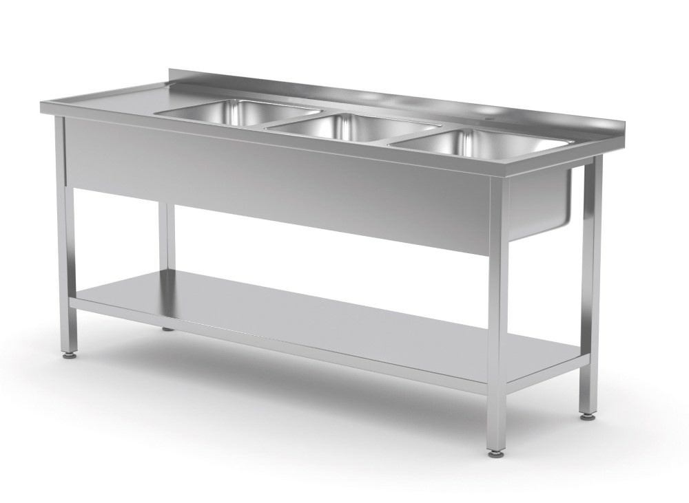 Stół ze stali nierdzewnej z trzema zlewami i półką - komory po prawej stronie o wymiarach 1500x700x(h)850 mm