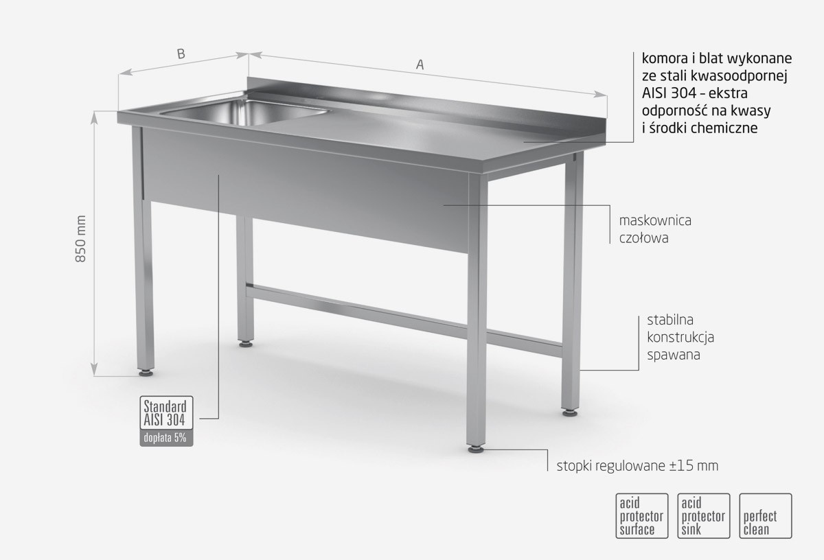 - zlew i blat wykonane ze stali nierdzewnej tzw. kwasówki AISI 304 o wysokiej odporności na kwasy i środki chemiczne,