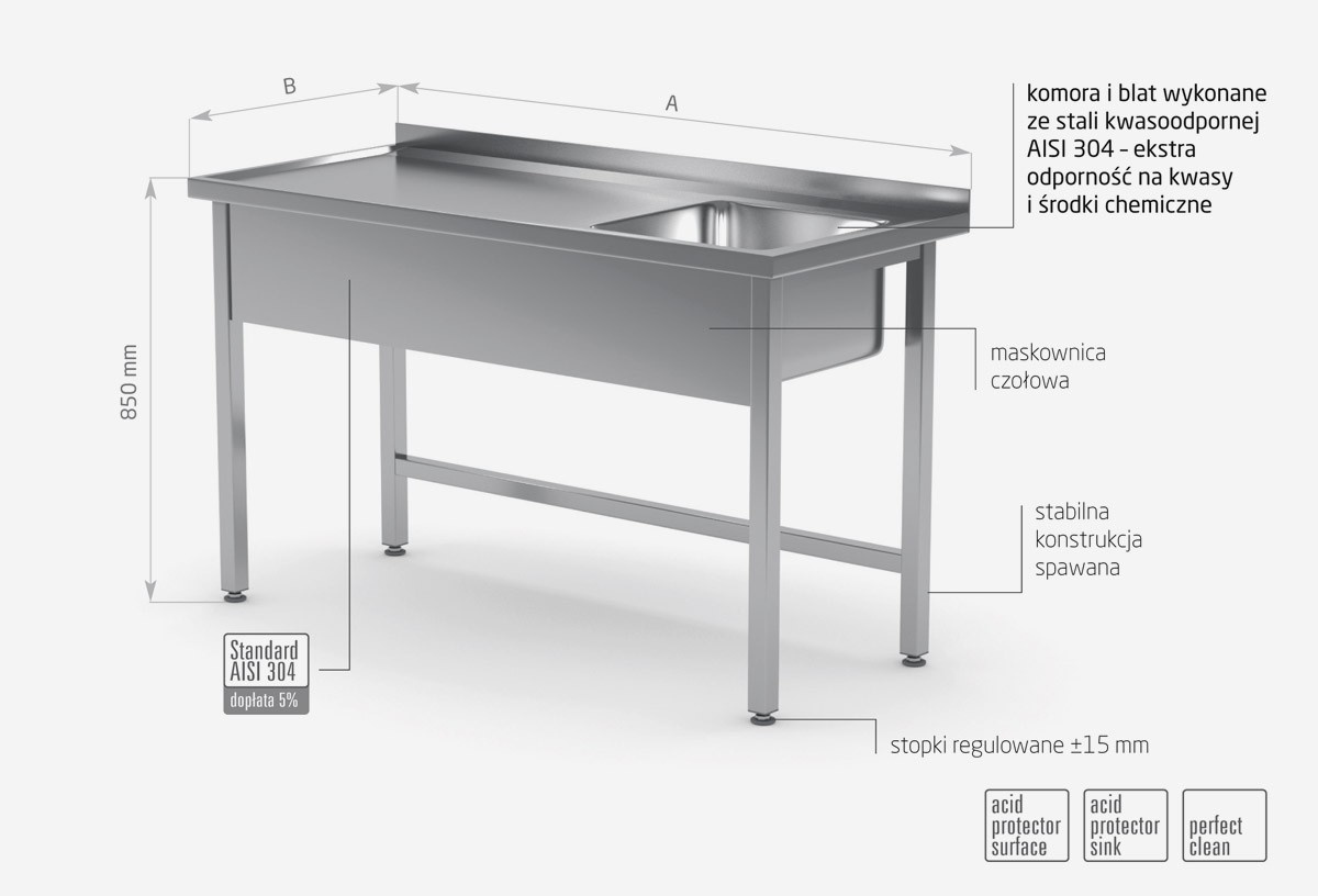 - zlew i blat wykonane ze stali nierdzewnej tzw. kwasówki AISI 304 o wysokiej odporności na kwasy i środki chemiczne,