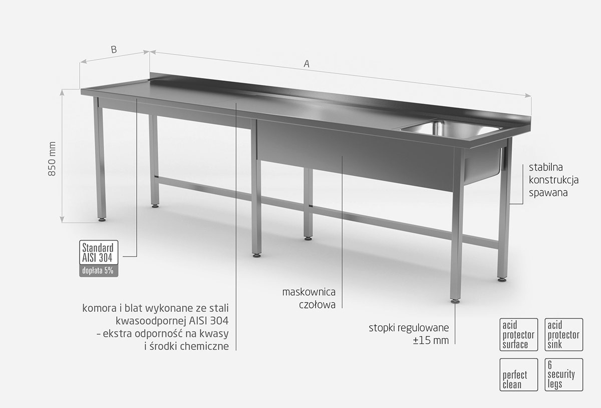 Stół ze stali nierdzewnej ze zlewem bez półki - komora po prawej stronie o wymiarach 2400x600x(h)850 mm