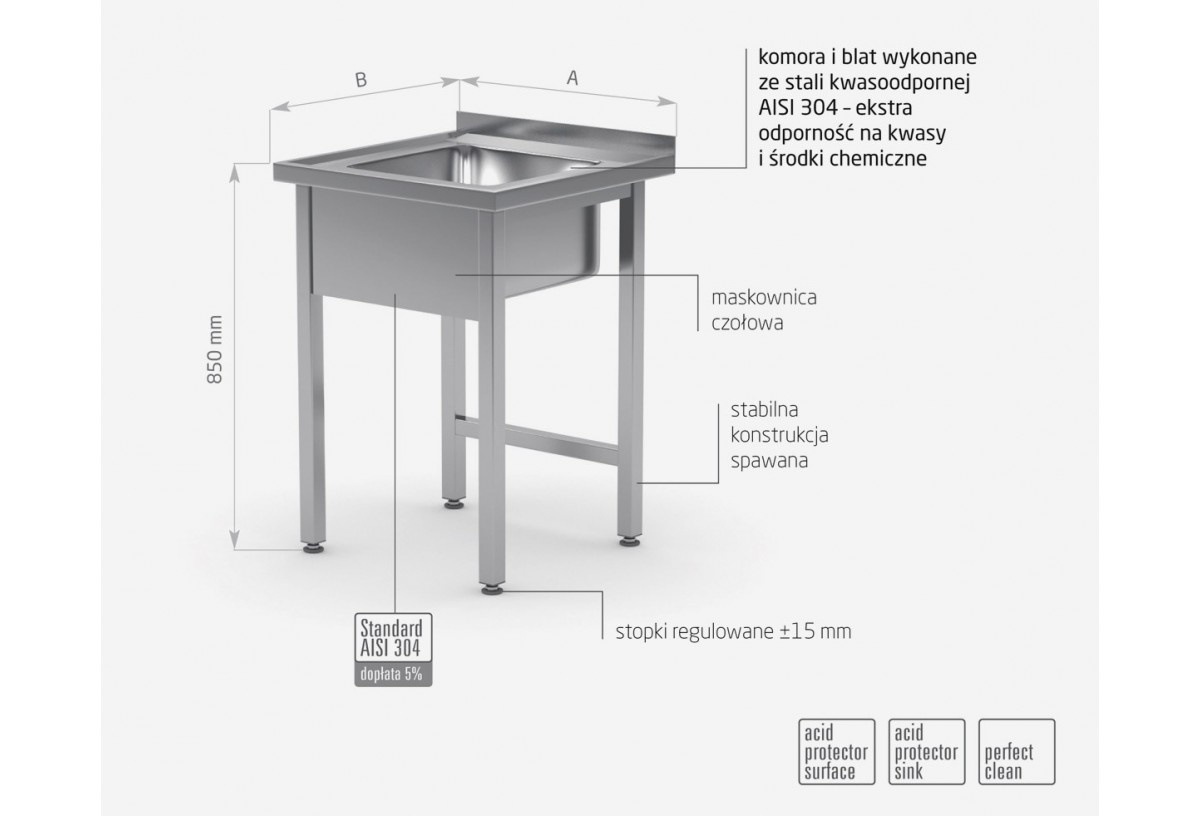 - zlew i blat wykonane ze stali nierdzewnej tzw. kwasówki AISI 304 o wysokiej odporności na kwasy i środki chemiczne,