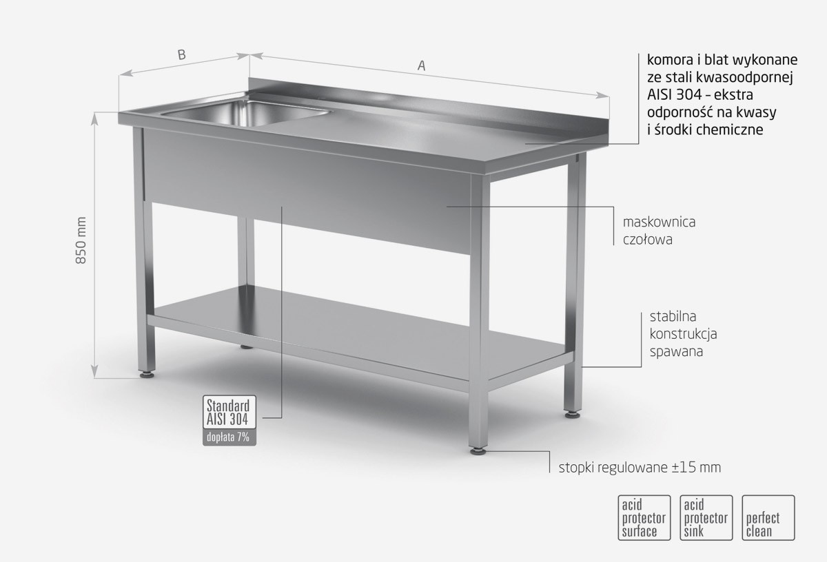 - zlew i blat wykonane ze stali nierdzewnej tzw. kwasówki AISI 304 o wysokiej odporności na kwasy i środki chemiczne,