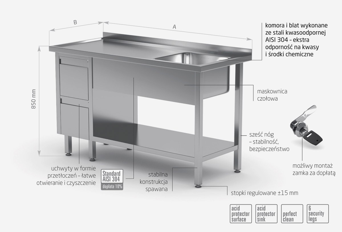 Stół ze stali nierdzewnej ze zlewem, półką i szafką z dwiema szufladami - komora po prawej stronie o wymiarach 1700x700x(h)850 mm