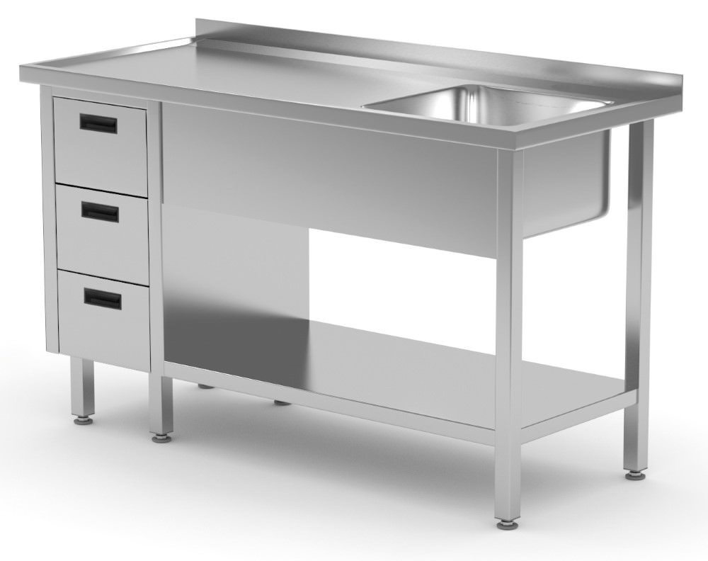 Stół ze stali nierdzewnej ze zlewem, półką i szafką z trzema szufladami - komora po prawej stronie o wymiarach 1800x600x(h)850 mm