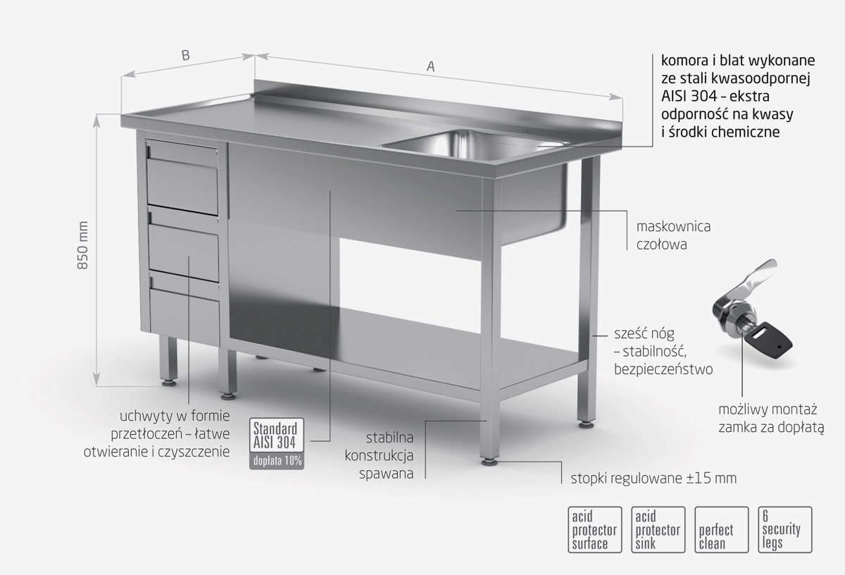 Stół ze stali nierdzewnej ze zlewem, półką i szafką z trzema szufladami - komora po prawej stronie o wymiarach 1900x600x(h)850 mm