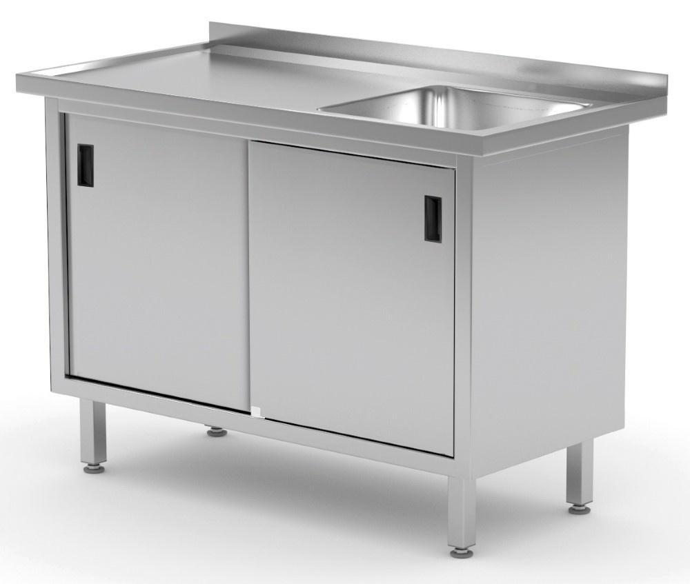 Stół ze stali nierdzewnej ze zlewem, szafka z drzwiami suwanymi - komora po prawej stronie o wymiarach 900x700x(h)850 mm