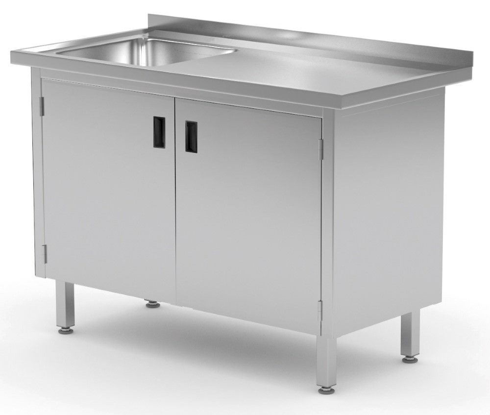 Stół ze stali nierdzewnej ze zlewem, szafka z drzwiami na zawiasach - komora po lewej stronie o wymiarach 1100x700x(h)850 mm