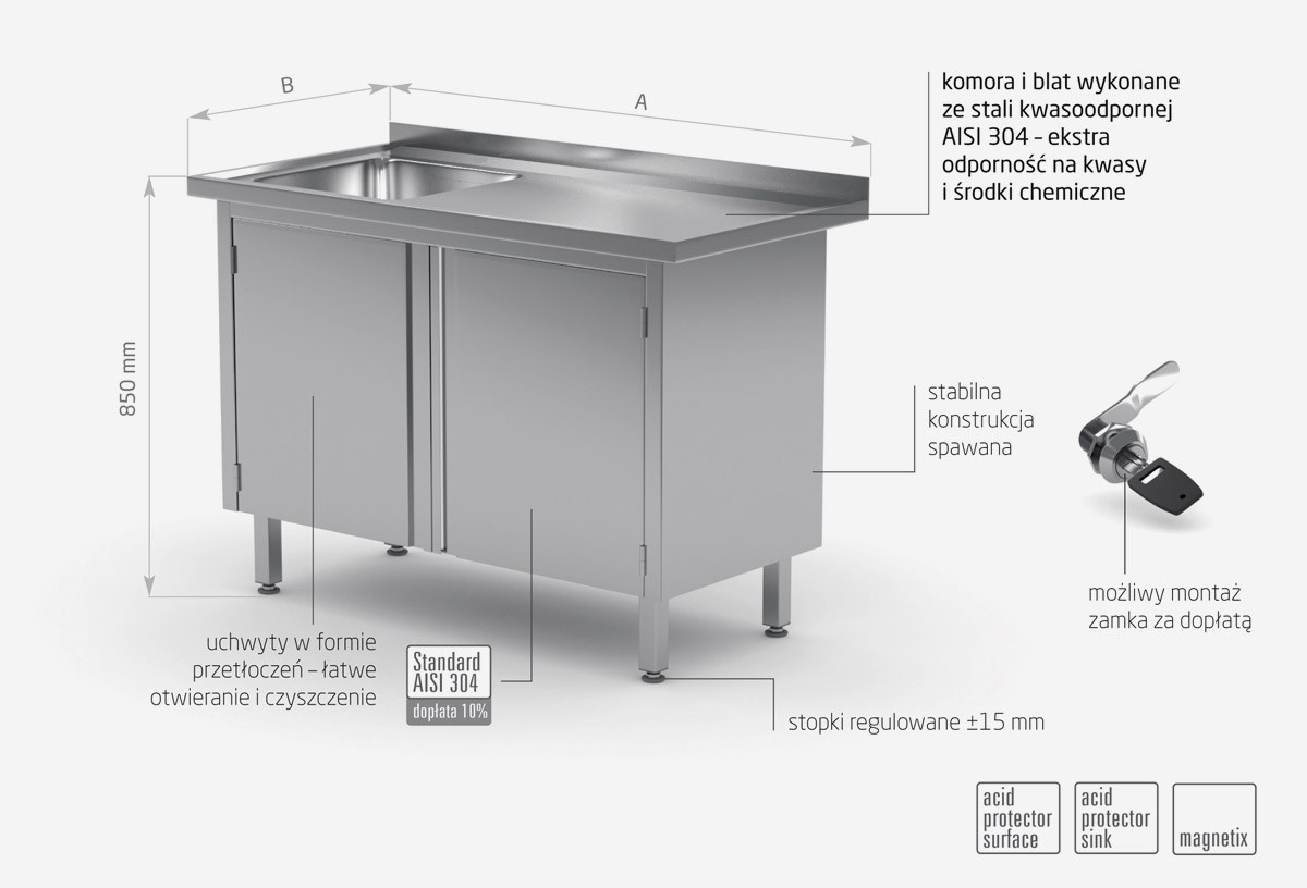 - zlew i blat wykonane ze stali nierdzewnej tzw. kwasówki AISI 304 o wysokiej odporności na kwasy i środki chemiczne,