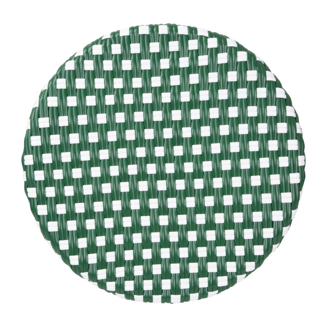 Z klasycznym zielonym wzorem w kropki, stołki te wspierane są przez lekką, ale solidną aluminiową ramę wykończoną efektem drewna. Siedziska wykonane są z trwałego sztucznego rattanu PE.