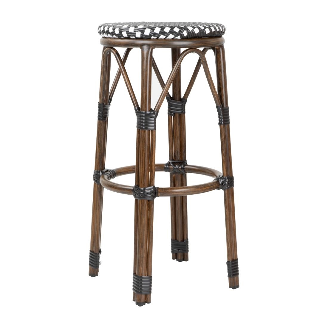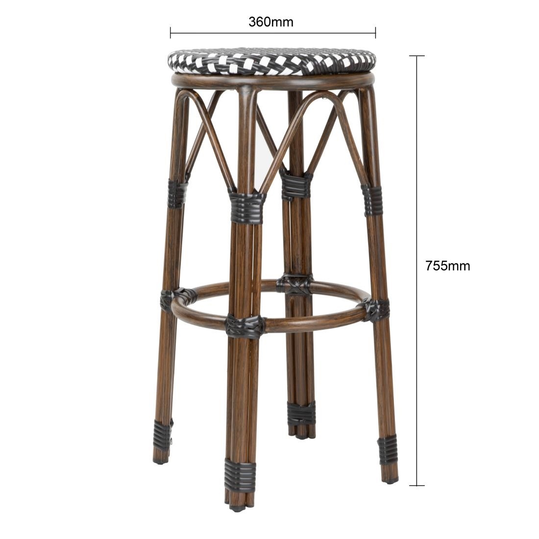 Z klasycznym czarnym wzorem w kropki, te stołki wspierane są przez lekką, ale solidną aluminiową ramę wykończoną efektem drewna. Siedziska wykonane są z trwałego sztucznego rattanu PE.