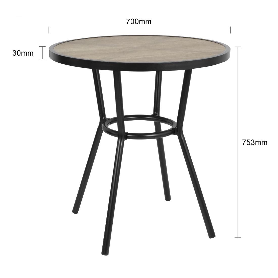 Stół o średnicy 700 mm zapewnia wystarczająco dużo miejsca do spożywania posiłków, a jego elegancki design doskonale komponuje się z różnymi stylami aranżacji. Wyposażony w solidną, czarną aluminiową ramę, gwarantuje długotrwałą trwałość, natomiast okrągły blat z wykończeniem w imitacji drewna na szklanej powierzchni nadaje mu atrakcyjny wygląd.