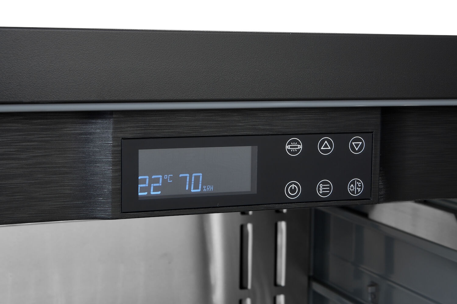 - Wbudowana lampa UVC do sterylizacji zapobiega rozwojowi bakterii i gwarantuje bezpieczne środowiska dla mięsa; po otwarciu drzwi szafy w trakcie procesu sezonowania bakterie nie będą miały szansy się rozwinąć.
