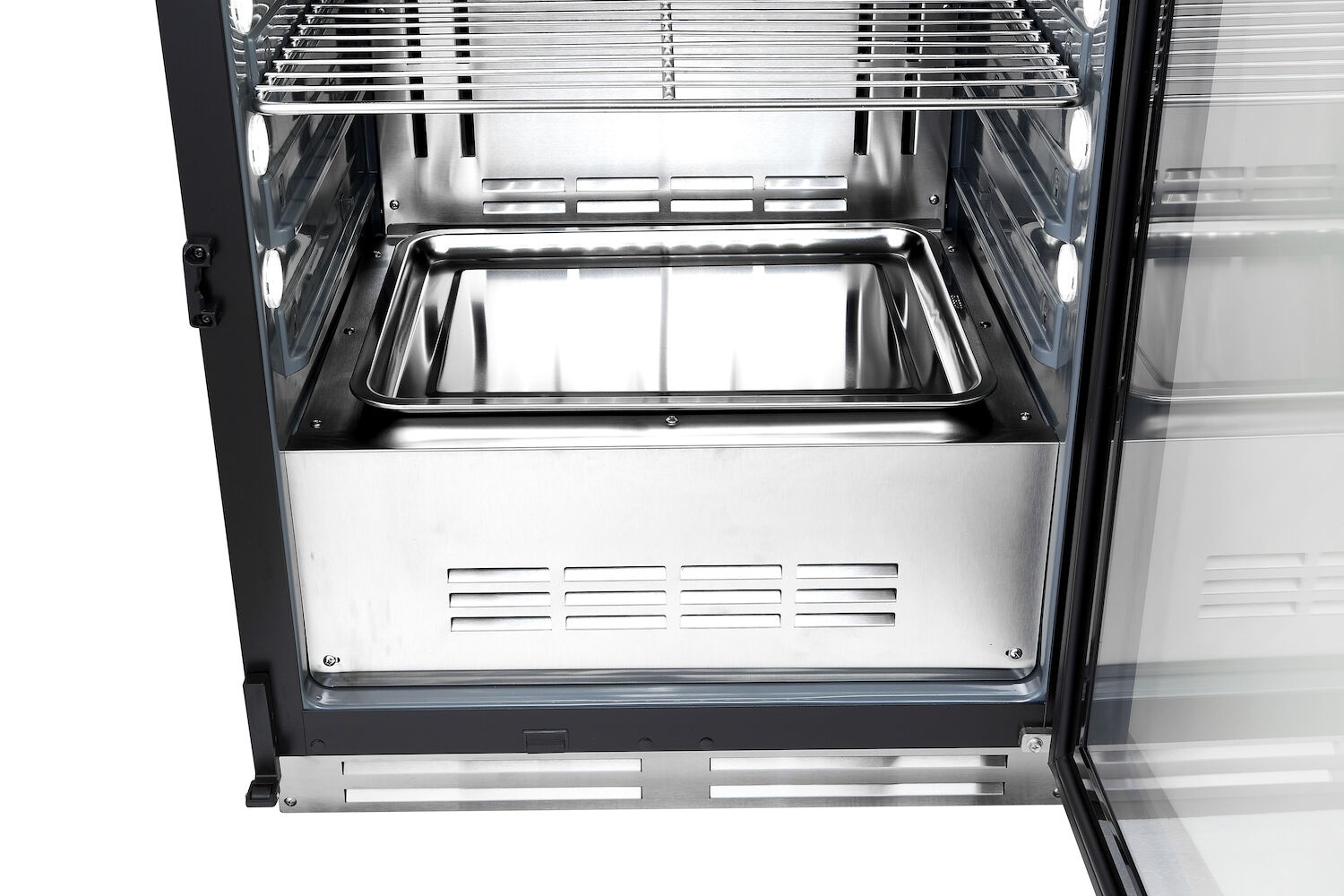 - Światła LED ulokowane po obu stronach komory oraz na suficie.