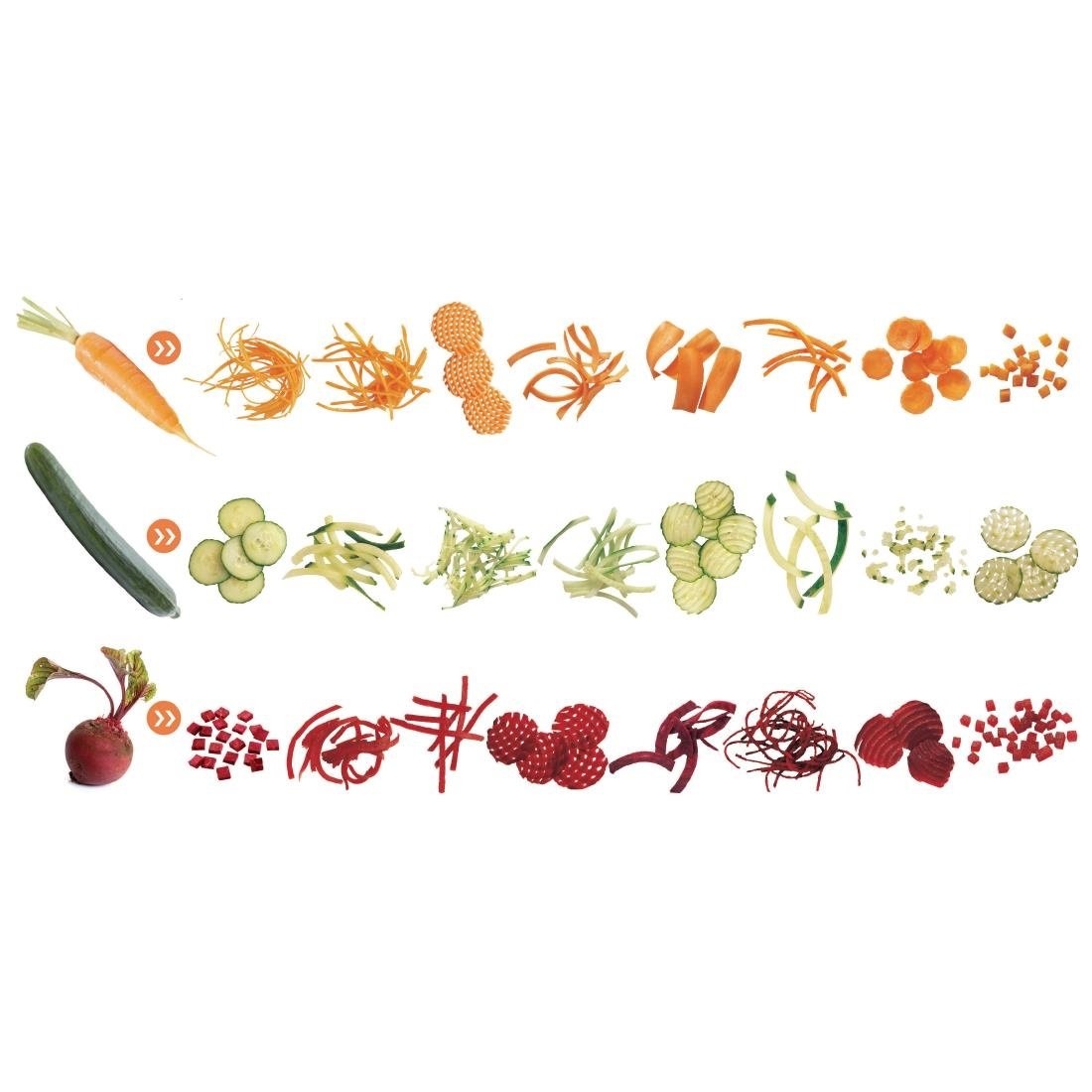 - Dostępne tarcze: krojenie, szatkowanie, julienne, kostka, faliste cięcia, frytki