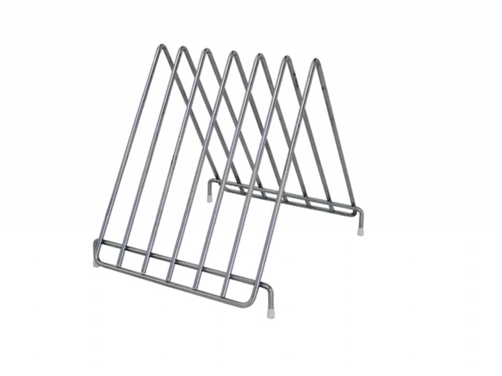 Wykonany ze stali nierdzewnej 18/10 stojak o polerowanych elektrolitycznie drutach o średnicy 7 mm. Posiada antypoślizgowe, gumowe nakładki. Pojemność: 6 desek o grubości 25 mm. Masywne wykonanie.
