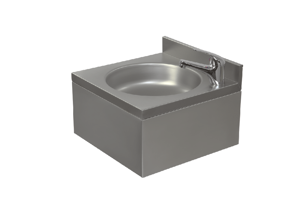 Umywalka ze stali nierdzewnej, jednokomorowa, obudowana, z zamontowaną baterią umywalkową stojącą, jednouchwytową. Bateria posiada mieszacz ceramiczny. Wymiary umywalki (dł x szer x wys) 400 x 400 x 220 mm. Głębokość komory 120 mm. Grubość blachy 1,0 mm. W komplecie zestaw mocujący do ściany oraz syfon.
