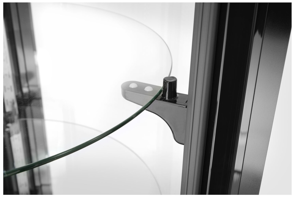 - 4 półki Ø535 mm o grubości szkła 5 mm, z regulacją co 30 mm na aż 32 możliwych poziomach, pozwalają na dostosowanie wysokość ich zamontowania w zależności od prezentowanego ciasta lub deseru.