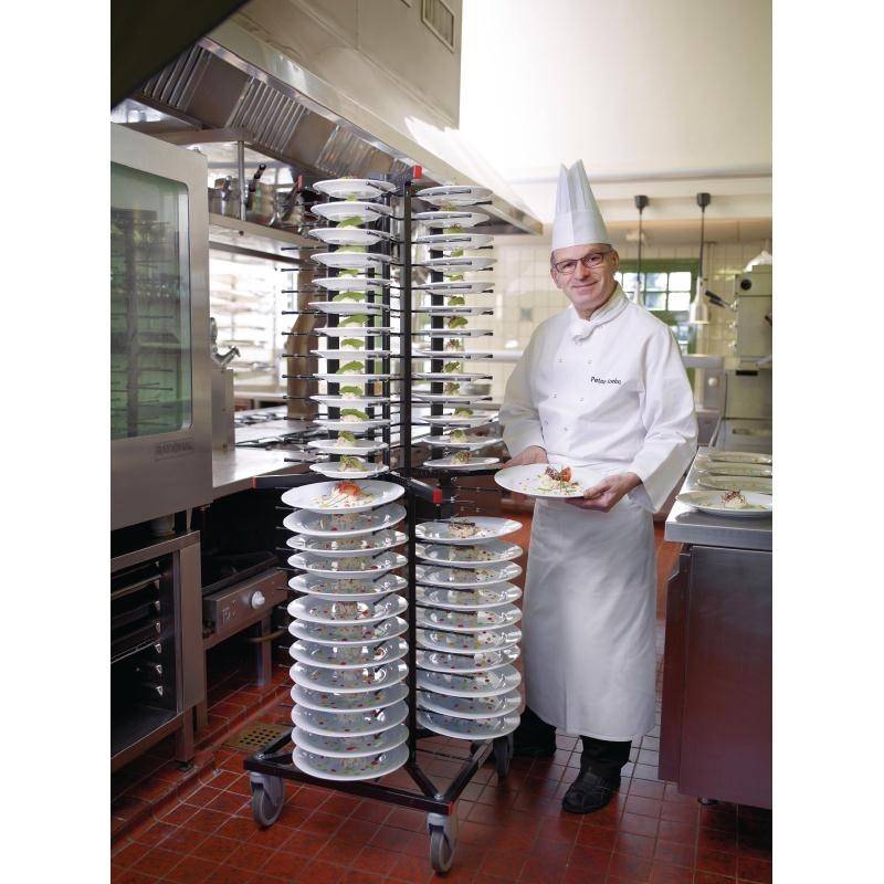 Wykorzystaj przestrzeń w swojej profesjonalnej kuchni jak najlepiej. Wózek został zaprojektowany do przenoszenia dużej ilości talerzy w prosty i szybki sposób. Pozwala np. przemieszczać duże ilości dań na salę lub zbieranie brudnych naczyń do kuchni. Oszczędza przestrzeń i czas pracy. Dostosowano do 104 talerzy.