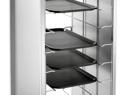 Bezpieczny transport pojemników GN, rusztów i blach maks. 1/1 GN na 10 parach prowadnic. Dzięki dodatkowej powierzchni do odstawiania z zabezpieczeniem transportowym również dzbanki, szklanki i butelki znajdą bezpieczne miejsce.Podmiot odpowiedzialny (GPSR):