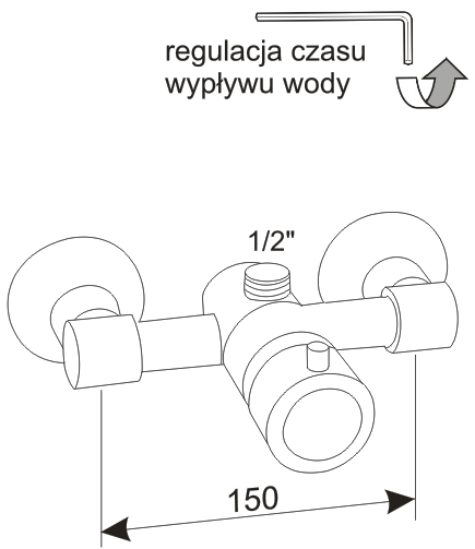Samozamykająca się bateria natryskowa, natynkowa, z mieszaczem wody zimnej i gorącej w głowicy. Podłączenie do instalacji za pomocą mimośrodów, standardowy rozstaw króćców przyłączeniowych 150 mm. Płynna regulacja czasu wypływu wody w przedziale od 0 do 30 sekund. Mechanizm zabezpieczający przed osadzaniem się kamienia. Wodooszczędna – przepływ ok. 8 l/min. Bateria wyposażona w filtry siatkowe, zawory zwrotne. Możliwość podłączenia tradycyjnego zestawu natryskowego, wylot 1/2″. Króciec wylotowy skierowany w dół.