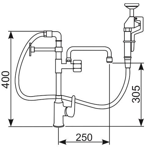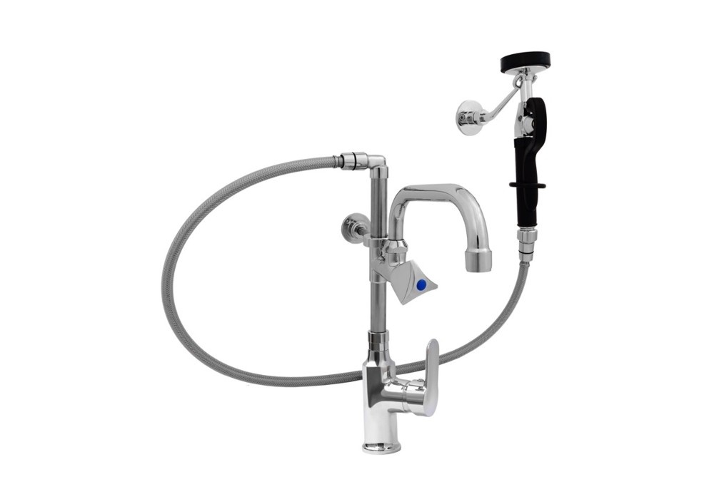 Bateria stojąca zlewozmywakowa, mieszająca, jednouchwytowa, z obrotową wylewką, spryskiwaczem prostym, z wężem ciśnieniowym i uchwytem ściennym spryskiwacza.