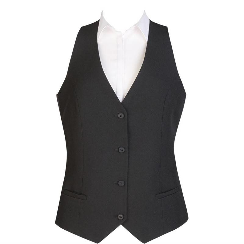 Dobrze skrojona, ładnie uszyta i dobrze pasująca kamizelka damska. Zaprojektowana z myślą o bardziej wymagających środowiskach cateringowych. Wykonano z odpornego poliestru, który dobrze wygląda nawet po całym dniu pracy. Łatwo się czyści, szybko schnie i dopasowuje się do sylwetki osoby noszącej. Klasyczne zapięcie na 4 guziki i regulowany pasek z tyłu.