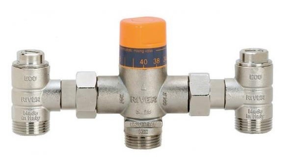 Uniwersalny mieszacz termostatyczny ciepłej wody użytkowej z pokrętłem regulacji temperatury wody zmieszanej wyskalowanym w stopniach C. Mieszacz wyposażony w blokadę antypoparzeniową (samoczynnie zamyka wypływ wody zmieszanej w przypadku braku dopływu wody zimnej). Wyposażony jest w zintegrowane przyłącza spełniające funkcje zaworów odcinających, zaworów zwrotnych, filtrów i półśrubunków. Maksymalna temperatura wody gorącej na wlocie do mieszacza – 110 stopni C. Mieszacz przeznaczony jest do małych instalacji ciepłej wody użytkowej, do instalacji grzewczych oraz instalacji solarnych. Przyłącza 3/4″ – przepływ do 55 l/min.