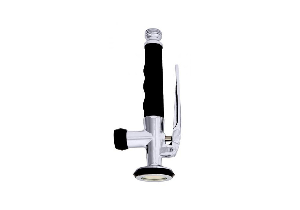 Mosiężna, chromowana głowica spryskiwacza w obudowie z miękkiej gumy. Możliwość zablokowania dźwigni wypływu wody na czas działania spryskiwacza.