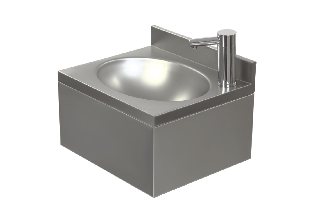 Umywalka ze stali nierdzewnej, jednokomorowa, obudowana, z zamontowaną baterią umywalkową elektroniczną, stojącą, z ręcznym mieszaczem wody zimnej i gorącej pod umywalką. Zasilanie baterii elektronicznej bateriami alkalicznymi 4×1,5V. Wymiary umywalki (dł x szer x wys) 400 x 350 x 220 mm. Głębokość komory 120 mm. Grubość blachy: 1,0 mm. W komplecie zestaw mocujący do ściany oraz syfon.