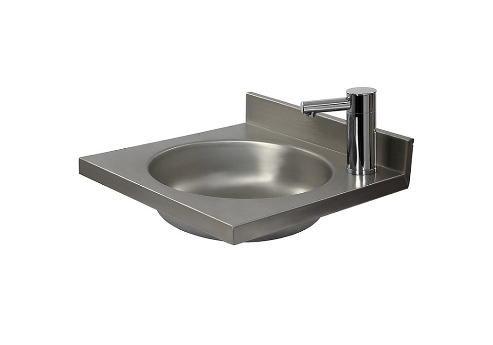 Umywalka ze stali nierdzewnej, jednokomorowa, z zamontowaną baterią umywalkową elektroniczną, stojącą, na wodę zimną lub ciepłą zmieszaną. Zasilanie baterii elektronicznej bateriami alkalicznymi 4×1,5V.