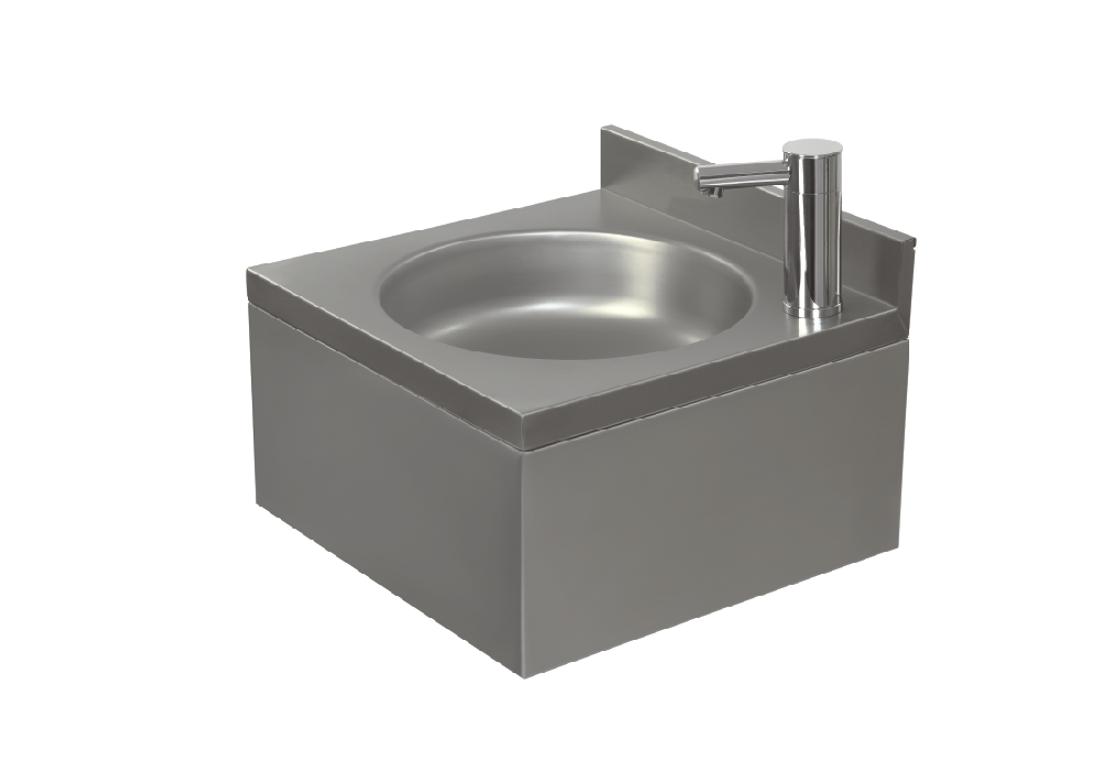 Umywalka ze stali nierdzewnej, jednokomorowa, obudowana, z zamontowaną baterią umywalkową elektroniczną, stojącą, z ręcznym mieszaczem wody zimnej i gorącej pod umywalką. Zasilanie baterii elektronicznej z zasilacza 230/6V. Wymiary umywalki (dł x szer x wys) 400 x 400 x 220 mm. Głębokość komory 120 mm. Grubość blachy: 1,0 mm. W komplecie zestaw mocujący do ściany oraz syfon.