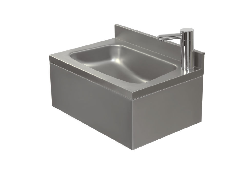 Umywalka ze stali nierdzewnej, jednokomorowa, obudowana, z zamontowaną baterią umywalkową elektroniczną, stojącą, na wodę zimną lub ciepłą zmieszaną. Zasilanie baterii elektronicznej z zasilacza 230/6V. Wymiary umywalki (dł x szer x wys) 500 x 350 x 220 mm. Głębokość komory 130 mm. Grubość blachy: 1,0 mm. W komplecie zestaw mocujący do ściany oraz syfon.
