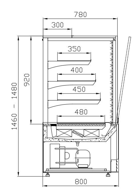 Witryna cukiernicza prostokątna, 410 L, od 5°C do 15°C, stacjonarna z agregatem