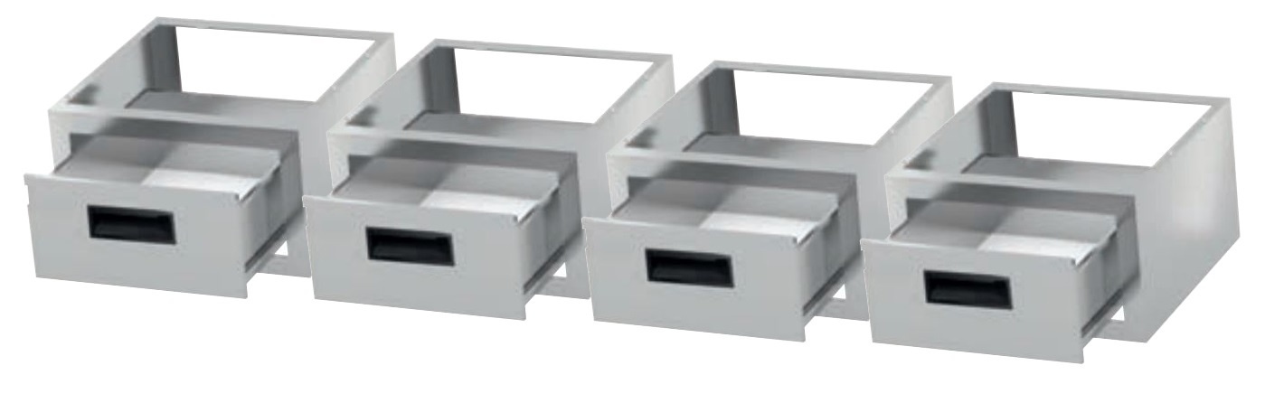 Zestaw czterech szuflad podwieszanych ze stali nierdzewnej o wymiarach 400x600x(h)260 mm
