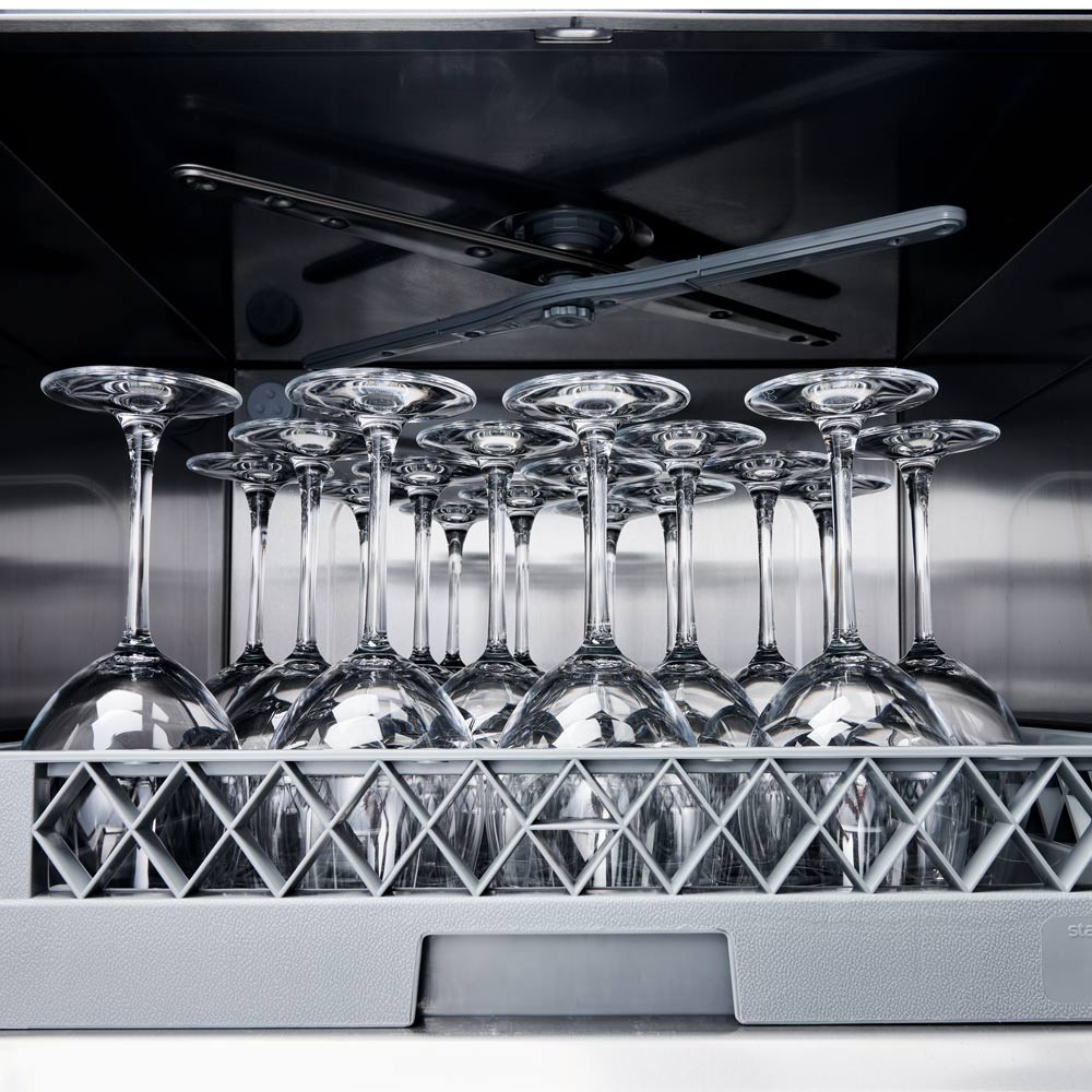nowoczesny design profesjonalna zmywarka z funkcją wyparzania sterowanie elektromechaniczne czytelne i trwałe oznakowanie na panelu sterowania / odpowiednio pochylony panel zapewniający komfort pracy ergonomiczny uchwyt przystosowana do mycia talerzy, szkła, tac i pojemników GN 1/1 maksymalna wysokość mytego naczynia 320 mm precyzyjny jelitkowy dozownik płynu nabłyszczającego cykl mycia 120 s lub 180 s wydajność koszy na godzinę - 30/h; 24/h pompa zrzutowa i/lub pompa wspomagająca płukanie (w wybranych wersjach) kontrolki temperatury pracy bojlera i komory 2 pary ramion myjąco-płuczących (góra/dół) zużycie wody 2.5 l/cykl moc grzałki komory - 2 kW moc grzałki bojlera - 3 kW lub 4.5 kW kosz 500x500 mm w komplecie 3 kosze: do talerzy, uniwersalny, do szkła oraz pojemnik na sztućce uniwersalny system zasilania umożliwiający konfigurację napięcia zasilającego 230 lub 400 V opcjonalnie możliwość zastosowania filtra powierzchniowego urządzenie powinno mieć zamontowany uzdatniacz wody w celu ochrony przed osadzaniem się kamienia w celu ochrony przed osadzaniem się kamienia i uzyskania optymalnej jakości mycia rekomendowane przez Stalgast profesjonalne płyny do zmywarek zapewniają doskonały efekt mycia wysokość komory wsadowej ~370 mm Wysokość: 835 mm Głębokość: 685 mm Szerokość: 565 mm Długość cyklu pracy: 120/180 sek Materiał wykonania: stal nierdzewna Marka: Stalgast Moc grzałki komory: 2 kW Moc zainstalowana: 5.4/6.9 kW Moc elektryczna: 3.4/4.9 W Moc grzałki bojlera: 3/4.5 kW Napięcie: 230/400 V Podmiot odpowiedzialny (GPSR):